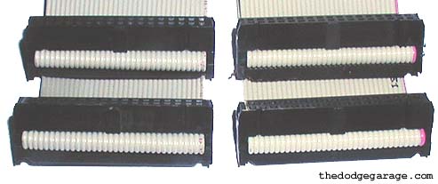 Shown above is a Quantum3d Mercury cable on the right and a regular old floppy cable on the left. The only difference between the two is the Mercury cable was 13" long, the floppy cable 21". You can try running it at 21" but I would shorten to prevent possible signal loss. When the cables are lying on the table one connector should be facing up, the other facing down.