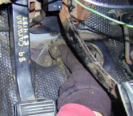 Now is a good time to remove the cutout in the sound deadener for where the cable passes through the firewall, pry out and set aside the rubber plug for the firewall hole and install the clutch pedal stop. On the upper left side of the pedal bracket near the firewall hole there is two 13 mm bolts, remove them and slip the stop in place and reinstall the bolts.